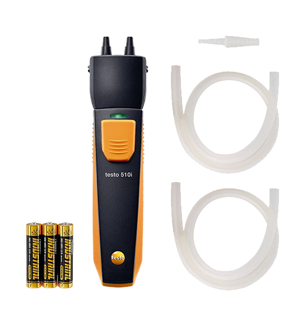 testo 510i 無線迷你差壓測(cè)量?jī)x ,包括帶適配器的軟管組件(直徑4毫米和5毫米)、電池以及校準(zhǔn)協(xié)議。